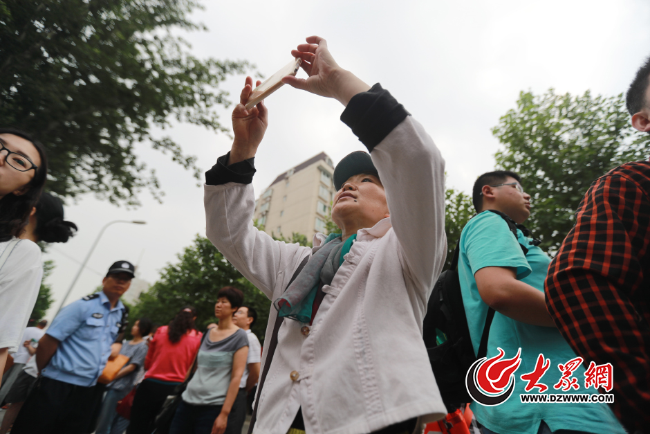 2016年全國高考大幕拉開。6月7日上午,為了給這個關鍵時刻留個紀念,陪伴孩子來到山師附中考點的家長們,紛紛拿起手機在考點外拍攝,記錄這一時刻。圖為一家長在考點外用手機拍攝進入校門的考生。大眾網記者 王長坤 攝