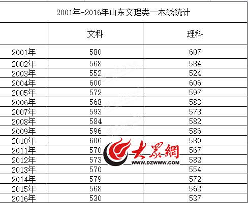 山東今年的文理科一本線到底有多低?記者梳理了自2001年以來,山東省近16年的文理科一本線發現,今年山東省的文科一本線是近16年來最低的,此前文科一本線最低分出現在2003年,當時山東的文科一本錄取控制分數線為552分。