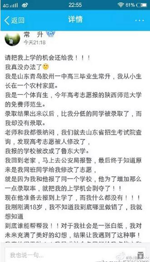 與此同時,另外一位老師告訴半島記者,這位叫做常升的同學告訴他,說那位同班同學曾在私下里承認,就是他修改了常升的志愿。