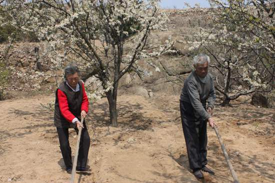 沒有錢、沒有樹、沒有工具、沒有人幫忙,60多歲的董宣和拿出了當年治山治水的激情,開始綠化荒山。一開始,董宣和買了40把鎬頭,為了更有效率,每天早上,他都要早早的起來把鎬頭磨得快快的。為了種樹,董宣和欠了一大筆債,為了能盡早的還債,每當下來新鮮瓜果,董宣和都要往返20多里山路來到小區。就這樣,用了3年的時間才把種樹時20多人的人工費給還清。董宣和王洪英拖著帶病的身體,和丈夫并肩干。沒有水,老兩口就從下面的水庫一桶一桶的挑上山,數萬棵樹木一棵一棵的澆。當問他植樹的最初想法和動力時,老人笑呵呵的說:“現在報紙和電視上也經常說全球氣侯變暖了,要多植樹。植樹是每個人應該做的事,再說我還是一名共產黨員,我有這個義務。尤其是我家里人也都支持我,我感到很欣慰”。