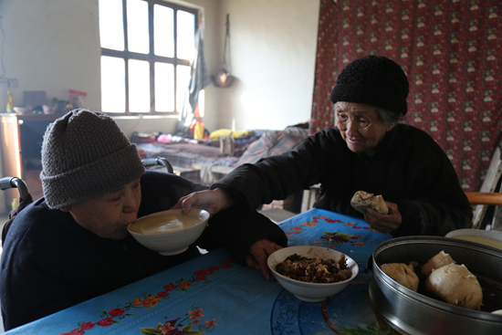 2012年,大兒媳突然得了重病。經(jīng)過治療,雖然挽回了生命,生活卻再也不能自理。大兒子家庭貧寒,依靠幾畝薄田度日。孫子孫媳都有工作,曾孫還在求學(xué)。兒媳沒人照顧,80多歲的高丕英毅然接過了照顧兒媳的重任。因?yàn)榘c瘓,兒媳婦內(nèi)心焦慮,經(jīng)常對(duì)她發(fā)牢騷,高丕英卻無怨無悔,還時(shí)常寬慰她。每天早晨,她得親自做好飯,一勺一勺喂到兒媳嘴里,已是84歲高齡的她,動(dòng)作不再敏捷,眼睛也有些昏花,有時(shí)候拿勺子的手會(huì)顫抖,甚至?xí)䴙⒊鰜怼5箖合眿D的一日三餐,一頓也沒落下過。