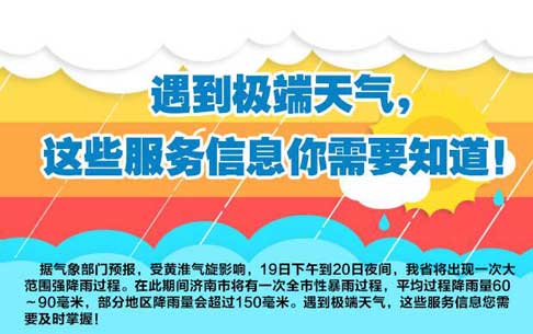 據省、市氣象部門預報,7月19日傍晚到20日濟南市將有一次全市性暴雨過程,平均過程降雨量60~90毫米,部分地區降雨量會超過150毫米。遇到極端天氣,這些服務信息你需要及時掌握! [詳細]