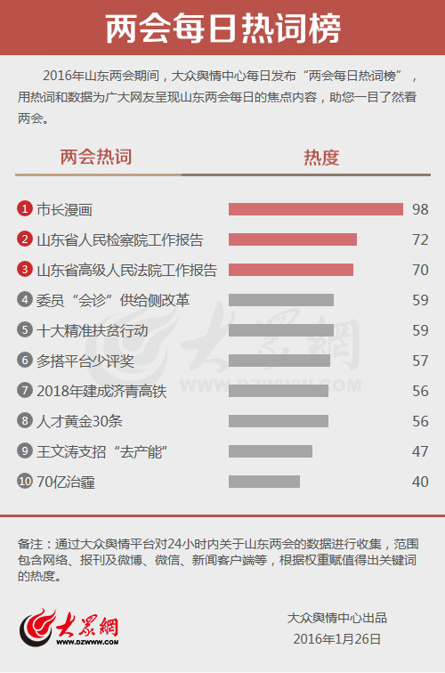 大眾網濟南1月26日訊記者 劉欣 王曉光 宋瑋瑋)今天,大眾輿情中心發布第四期“兩會每日熱詞榜”。“市長漫畫”“山東省人民檢察院工作報告”“山東省高級人民法院工作報告”分別以98、72和70的熱度進入熱詞榜前三名。