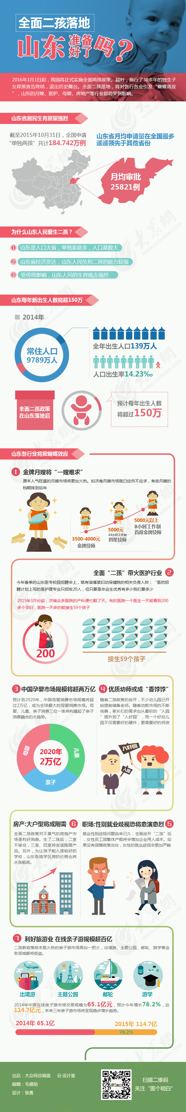 大眾網(wǎng)12月29日訊 2016年1月1日起,我國將正式實施全面兩孩政策。屆時,施行了30多年的獨生子女政策宣告終結,退出歷史舞臺。全面二孩落地,將對各行各業(yè)引發(fā)“蝴蝶效應”,山東的月嫂、醫(yī)護、母嬰、房地產(chǎn)等行業(yè)都將受到影響。