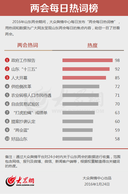 大眾網1月24日訊記者 劉欣 王曉光 宋瑋瑋)今天,大眾輿情中心發布第二期“兩會每日熱詞榜”!罢ぷ鲌蟾妗 “山東‘十三五’”“人大開幕”等熱詞分別以98、92、85的熱度位居前三。