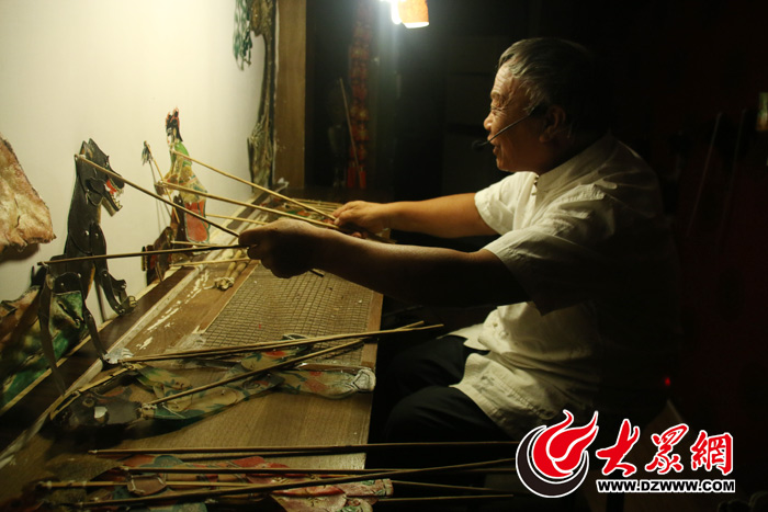 大眾網(wǎng)濟南8月15日訊(記者 尹延杰)“相約文博會 齊魯記者行”采訪團近日走進泰安采訪傳說中的皮影戲。在人們印象中,皮影戲都是團隊協(xié)作來表演,有七、八個人的,也有幾十個人的,然而,大眾網(wǎng)記者在泰安見到了一位獨立完成一出皮影戲表演的人——泰山皮影第六代傳人范正安。