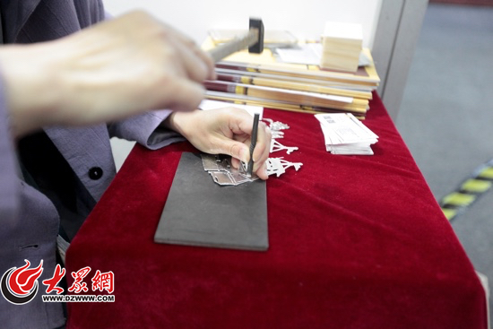 威海錫鑲技藝已有近百年歷史,制作者用小錘子和小鑿子在薄如紙片的錫片上無數次錘打鑿刻,勾勒出動物、風景等圖畫,然后或者保留原色、或者鍍金,再鑲嵌在紫砂壺、瓷器、玉器等器物之上。錫鑲之后的器物顯得雍容華貴,給原本平淡的器物平添了幾分靈氣。技藝傳承人李江玉和谷偉在現場演示和介紹該項技藝,現場展示的錫嵌茶具等作品雖然售價不菲,但是仍不斷吸引觀眾和采購商前來購買、詢價。