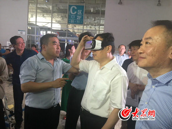 大眾網濟南8月24日訊(記者 張娜 王亞男)8月24日下午,山東省委常委、宣傳部部長孫守剛來到濟南國際會展中心,察看第六屆山東文化產業博覽交易會籌備布展工作,濟南市委常委、宣傳部部長譚延偉陪同察看。在大眾報業集團展區,孫守剛稱贊其展示的VR新技術“先進、清晰”。
