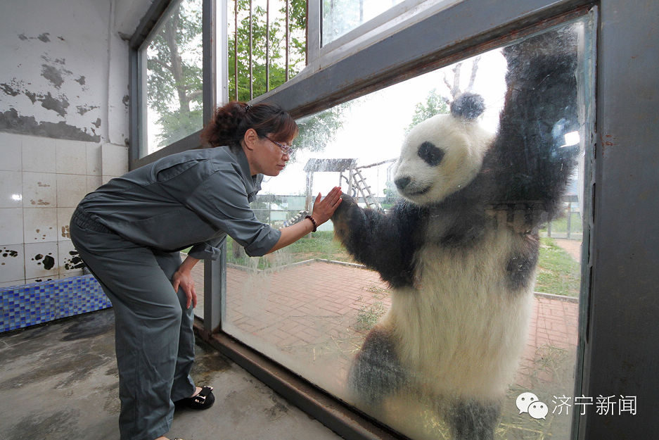 2014年6月9日,在煙臺市南山公園動物園,因四川地震原因被寄養在這里的大熊貓“華奧”和“清風”將被送回位于四川臥龍的大熊貓繁育基地。臨行前,“華奧”與曾經喂養過它的飼養員“握手”惜別。煙臺日報記者 唐克 攝
