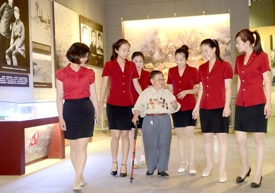 6月27日,在樂陵市冀魯邊抗日紀念館,一位身高1.2米的老人正在給年輕解說員講解冀魯邊抗戰故事。他就是90歲高齡的抗戰老兵李安甫。李安甫1925年4月出生于樂陵劉橋村。13歲投奔肖華的部隊,參加革命。他槍法準,經常執行刺殺一些罪大惡極日本軍官的任務,并多次立功。