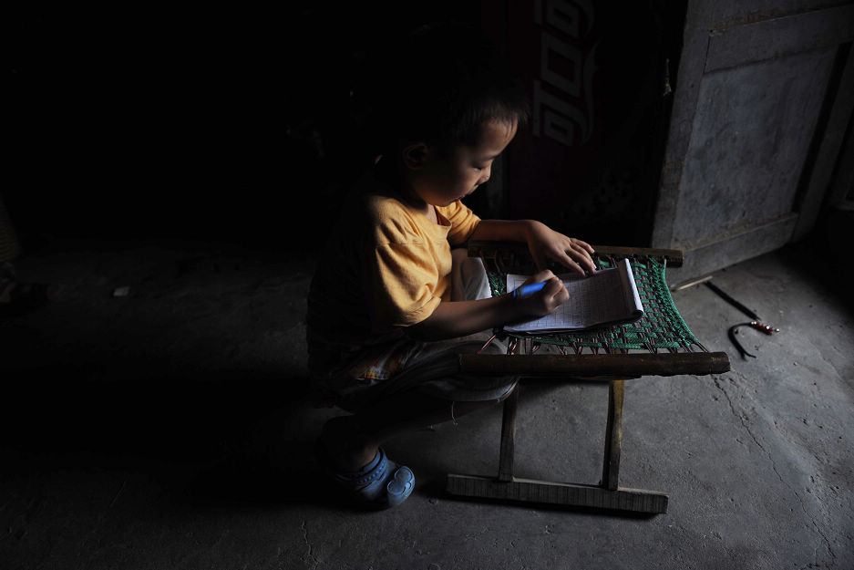 百年破房 李宗瑤 6歲 一所破舊不堪昏暗的百年老房內,瑤瑤借助室外光線看書寫字。