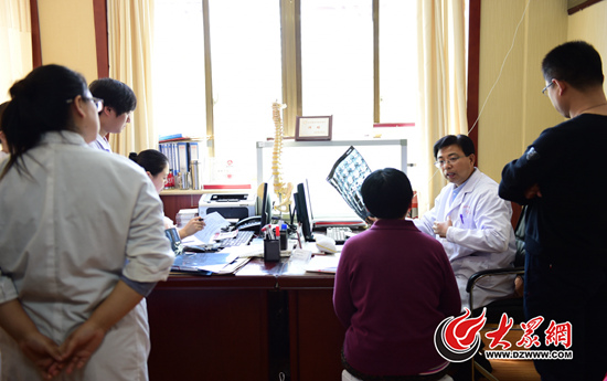 在濟南市經十路18877號,有一所名為山東省醫學科學院頸肩腰腿痛醫院的中醫骨科醫院,這家醫院因不做手術就能神奇地解除頸椎、腰椎病痛為人們所熟知,每天都有許多全國各地慕名前來求醫的患者。4月15日,在該院二樓的中醫骨傷科門診室里,像往常一樣,該院院長師彬在患者和徒弟們十幾人的包圍中,聚精會神地看著患者陳蘭(化名)的脊椎影像片子。