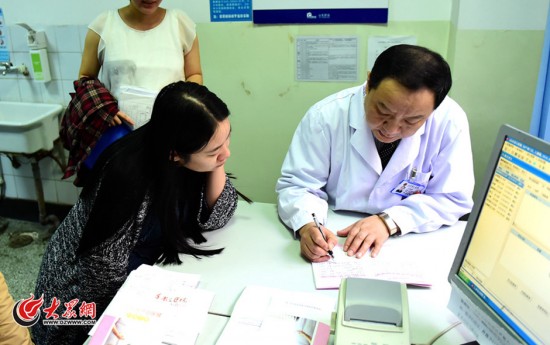 王謝桐認真書寫病歷,不少孕婦看到病歷上的診斷都連連點頭。大眾網(wǎng)記者 王長坤 馬俊驥 攝