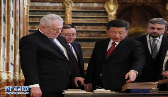 3月30日,國家主席習近平在捷克總統澤曼陪同下在布拉格參觀斯特拉霍夫圖書館。新華社記者 蘭紅光 攝