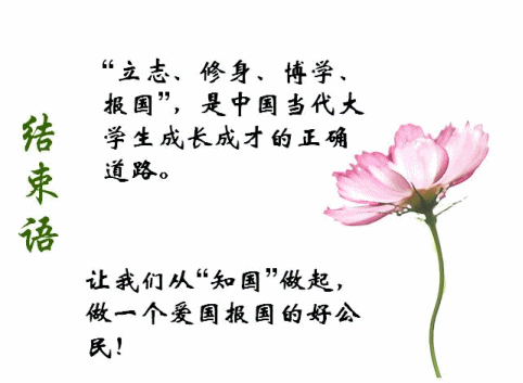 正確認識祖國的歷史和現實,增強愛國的情感和振興祖國的責任感,樹立民族自尊心與自信心;弘揚偉大的中華民族精神,高舉愛國主義旗幟,銳意進取,自強不息,艱苦奮斗,頑強拼搏,真正把愛國之志變成報國之行。今天為振興中華而勤奮學習,明天為創造祖國輝煌未來貢獻自己的力量!
