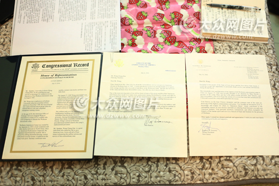 這次與王成漢見面,瑪麗還帶來了特殊的“禮物”——來自美國新澤西州參議院主席Stephen M. Sweeney和美國駐中國大使館大使Max Sieben Baucus的感謝信。Stephen在給王成漢的感謝信中寫道:作為當年美軍7人行動小組的翻譯并且是當中年齡最小的一人,您的英勇行為值得我們最高的推崇與贊美。您的貢獻、承諾以及努力是人類頑強精神的典范,更是濰縣集中營里那些人的自由與希望的燈塔。Max則在感謝信中說,二戰期間中美兩國人民都做出過巨大的犧牲,在艱難的日子里一直互相幫助,從王成漢的英勇行為以及其他中國人民所做的努力當中,我們都受到很大鼓舞。他還希望能夠有機會把王成漢介紹給在大使館工作的其他同事,那些跟王成漢一樣,為了建立中美兩國友誼紐帶而不懈努力的人們。