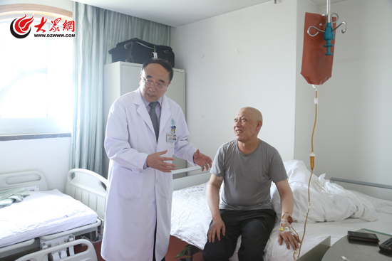 張金成(化名),是一名來自云南昆明的肺癌患者,受盡惡性腫瘤折磨,曾輾轉(zhuǎn)多家醫(yī)院。他選擇過“朋友介紹”、選擇過“網(wǎng)絡(luò)推薦”,在北京、上海等多家醫(yī)院都曾治療過,但頭發(fā)一直在掉,病情卻未曾減輕,最后他來到了山東省腫瘤醫(yī)院。5月5日,在山東省腫瘤醫(yī)院院長于金明查房期間,征得張金成同意后,大眾網(wǎng)記者跟隨于金明來到了他的病房。