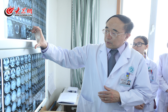 于金明院長在認(rèn)真查看病人的腦電圖。(亓翔 攝)