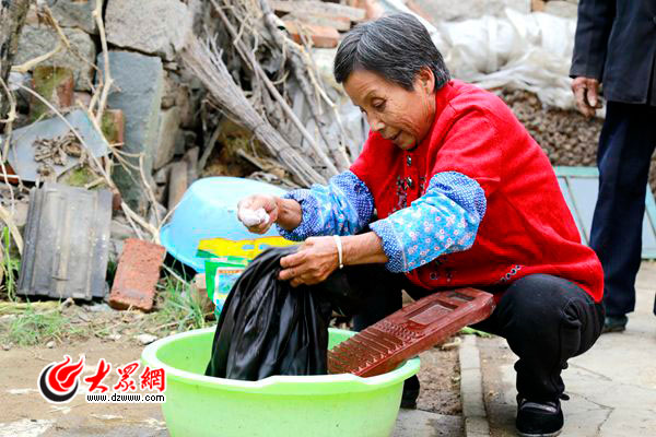 貧困戶陳淑芳與郭公正結成互助對子,洗衣服、打掃衛生,照顧爺倆日常起居。(大眾網記者 鄒慧 攝)
