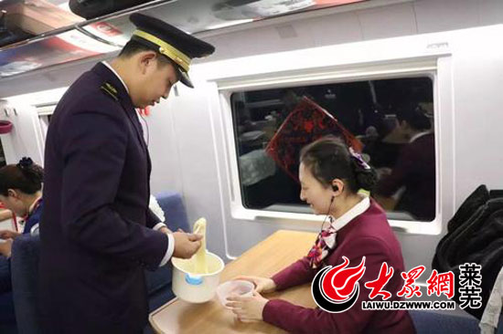 大眾網萊蕪2月14日訊(記者 亓秀寶)張超冉,是一名普通的列車員,她擔當列車員已有三年,猴年除夕她正在飛速的列車上值班,而這一天恰巧也是她的生日。不能回家陪家人過年,也不能和家人一同度過生日,但是在這一天,張超冉得到了意外的生日禮物,整個高鐵車廂一路幸福滿載。