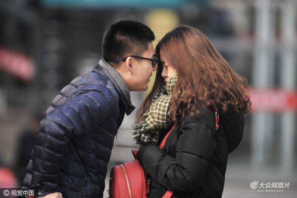 2017年1月18日,2017年春運進入第六天,青島火車站上演著一幕幕送站大戲,一邊是腳步匆匆的離別;一邊是難以割舍的溫情。不少年輕伴侶或牽手或吻別,場景令人動容。