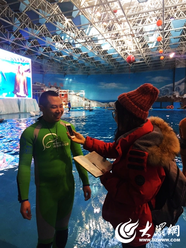 因?yàn)轳R上就要演出了,在采訪結(jié)束后,郭曉東匆匆換上了潛水服,他和搭檔琪琪馬上又要為臺下的觀眾表演了。