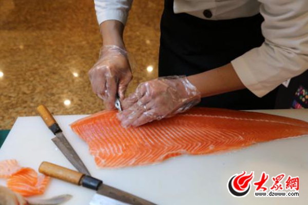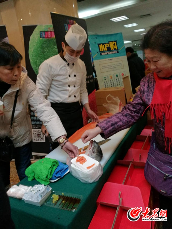 據了解,今天是首屆山東電商年貨節的“海味日”,除了可以品嘗到最新鮮的高品質三文魚,同時,從今天起,現場購買三文魚產品還有優質紅酒相送。海參也是年貨節上的選購熱點。