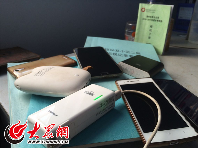 包海濤的辦公桌上擺滿了備用手機和充電寶
