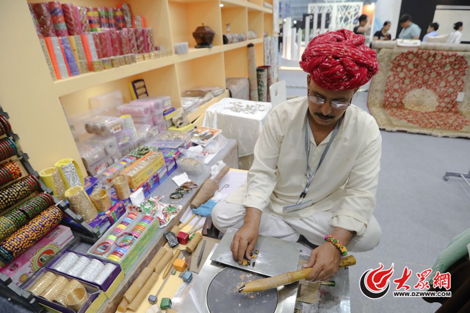 7號(hào)館“一帶一路·國(guó)際館”呈現(xiàn)出中西文化交相輝映,古老技藝與現(xiàn)代創(chuàng)意激烈碰撞的場(chǎng)景。圖為印度展區(qū)一位印度工匠盤(pán)膝而坐,手持木棒在爐子上來(lái)回翻滾,制作手環(huán)。大眾網(wǎng)記者 王長(zhǎng)坤 攝