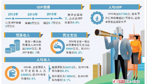 如同邁上“開往春天的地鐵”,山東的經濟文化強省建設櫛風沐雨、平穩(wěn)前行,駛過不平凡的五年:2012年,山東GDP突破5萬億元;2015年突破6萬億元;去年超過6.7萬億元,穩(wěn)居全國前三,占全國GDP的比重為9.0%。