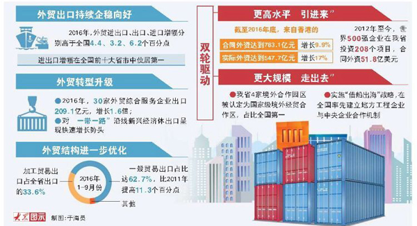 外貿新業態等新發展動能的積聚,帶動對外貿易結構進一步優化,2016年1-9月份加工貿易出口占全省出口的33.6%,一般貿易出口占比達到62.7%,比2011年提高了11.3個百分點。