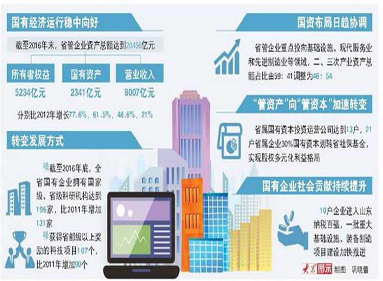 在山東,國企改革是事關發(fā)展全局的大文章。上世紀90年代領國有中小企業(yè)改革風氣之先的山東,在新一輪國企改革中再次“勇于擔當”:組建國有資本投資運營公司、完善公司治理結構、經(jīng)營性國有資產(chǎn)統(tǒng)一監(jiān)管……一系列精準化改革推動山東國有資本布局結構加速優(yōu)化調(diào)整。截至2016年末,省管企業(yè)資產(chǎn)總額達到20456億元,所有者權益5234億元,國有資產(chǎn)2341億元,營業(yè)收入8007億元,分別比2012年增長77.6%、61.5%、48.6%、21%。