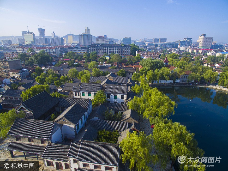 2016年06月24日,山東省濟南市,航拍千年濟南明府城百花洲,青磚黛瓦、家家泉水,戶戶垂楊,腳踏石板路,再現老濟南古色古香的原始建筑風貌。 明府城—百花洲片區位于明湖路南側,東起縣西巷新坊巷,西臨百花洲,南至后宰門街,北臨大明湖景點。百花洲,在大明湖公園南門牌坊以南,一路之隔,有一碧波粼粼的小湖,面積7000余平方米,岸邊弱柳臨風,嬌柔婀娜,水中碧蓮映日,紅荷爭艷。從空中俯瞰,整個百花洲與南側的泉水特色老民居格調保持統一,“青磚黛瓦”、古香古色的建筑與泉水相依相伴,將“家家泉水,戶戶垂楊”的泉城特色民居風貌詮釋的淋漓盡致。