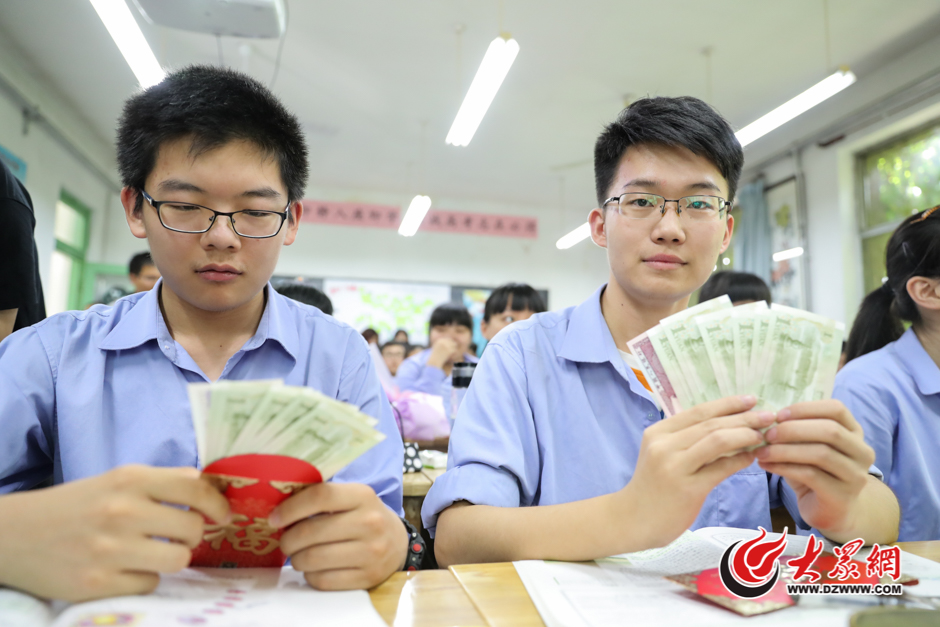 山東省實(shí)驗(yàn)中學(xué)高三一班班主任呂秀亭老師為學(xué)生們每人發(fā)了7元五角的紅包。高考滿分750分,呂老師希望以此能祝福每位學(xué)生都能考出好成績(jī)。大眾網(wǎng)記者 王長(zhǎng)坤 攝