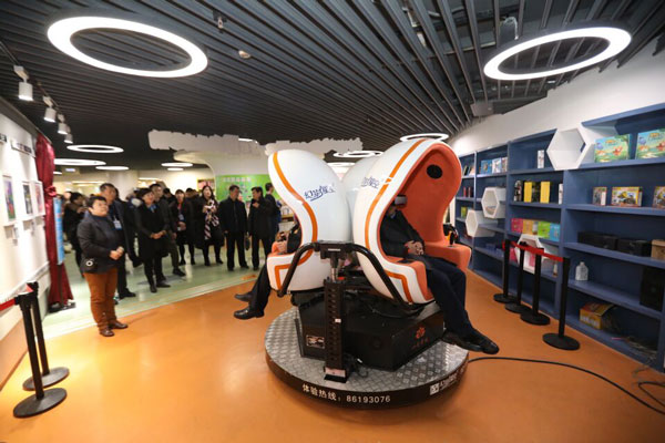 “第十三屆中國網(wǎng)絡(luò)媒體山東行”采訪團(tuán)記者體驗(yàn)書城中的動(dòng)感電影。