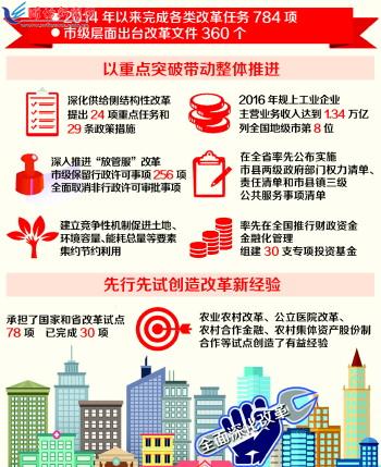 改革大潮,競相涌動。黨的十八屆三中全會開啟了全面深化改革的新征程。我市根據(jù)中央部署、省委省政府要求、全市發(fā)展需要和基層實際,科學(xué)制定總體方案、年度計劃,各項改革堅持于法有據(jù),依法有序。四年來,市委全面深化改革領(lǐng)導(dǎo)小組共召開27次會議,審議通過77個重要改革方案,著力推動了中央和省出臺的改革文件、承擔(dān)的國家和省改革試點以及年度工作要點任務(wù)和重點改革事項的落實。2014年以來,我市完成各類改革任務(wù)784項,市級層面出臺改革文件360個,一批制約經(jīng)濟(jì)社會發(fā)展的突出矛盾和問題得到解決,創(chuàng)造了一系列改革創(chuàng)新的經(jīng)驗?zāi)J?全市經(jīng)濟(jì)社會保持了持續(xù)健康發(fā)展。