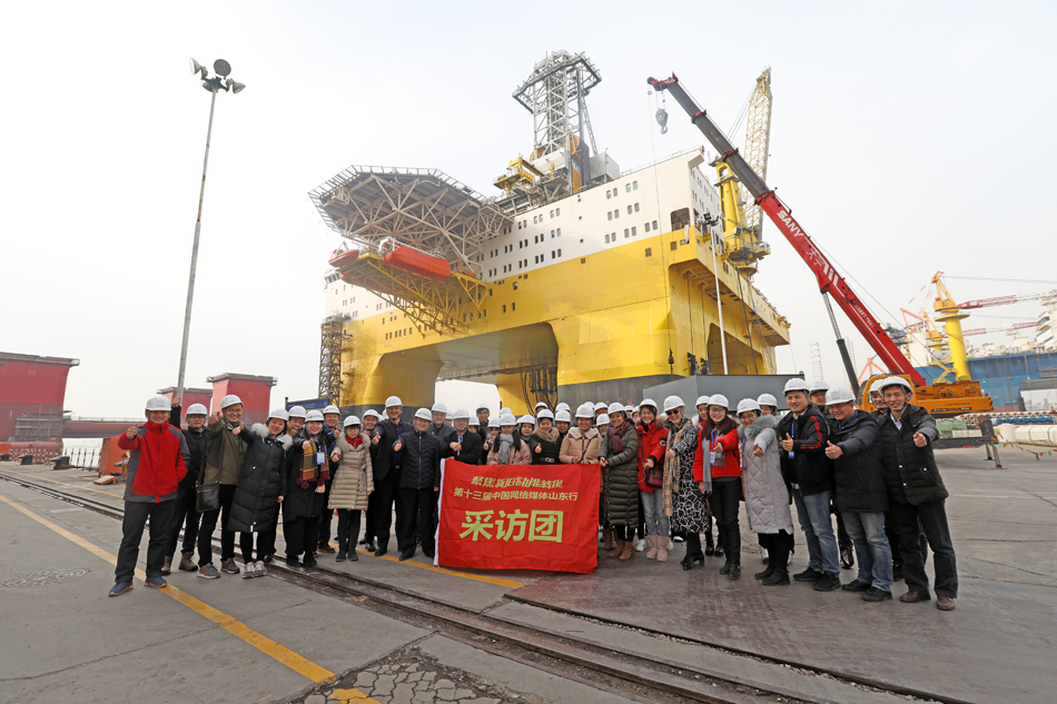 采訪團(tuán)的記者在中集來福士藍(lán)鯨二號(hào)前接受采訪。