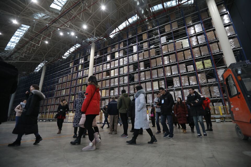 在灌裝區內,快速運轉的生產線吸引了采訪團的注意。偌大的車間內只有寥寥幾名員工,生產全程都由機器自動完成。在葡萄酒包裝線上,成品酒紙箱由機械臂自動上料、抓取和拆封,自動化程度令人嘆為觀止。據灌裝中心的工作人員介紹,當機械臂工位發出缺料的指令后,立體倉庫自動上料至提升機,然后由AGV無人駕駛激光制導小車自動輸送至機械手上料處,這樣下來大大解放人力,且能夠連續不間斷地進行工作。