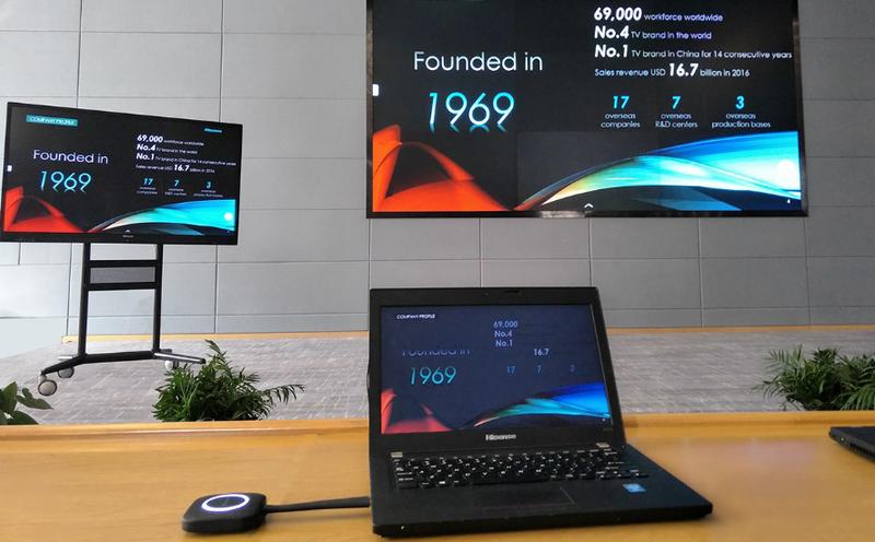 海信商用顯示公司副總經理李學釗介紹,在傳屏上,產品支持最大傳輸1080p* 30幀/秒,其內置雙頻WiFi AP,無需外置無線路由,與會者可輕松聯網自由傳屏。與普通傳屏技術相比,海信傳屏技術具有配置連接迅速、傳屏幾乎無時延的強大優勢。