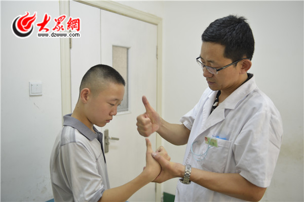 山大二院兒外科主任李金良正在為腦癱患兒做檢查
