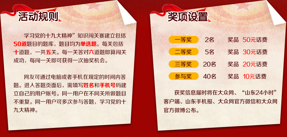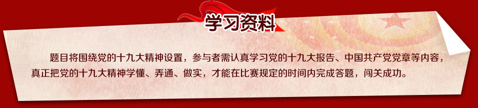 黨的十九大,描繪了決勝全面建成小康社會、奪取新時代中國特色社會主義偉大勝利的宏偉藍圖。深入學習宣傳貫徹黨的十九大精神,是當前和今后一個時期全黨全國的首要政治任務。為了深入學習宣傳貫徹黨的十九大精神,切實學懂、弄通、做實黨的十九大精神,大眾網策劃推出“學習黨的十九大精神”知識闖關賽。