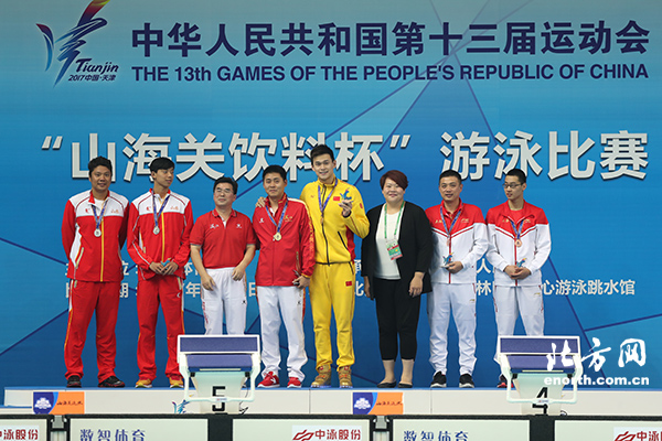 8月31日,第十三屆全運會游泳大項正式在天津奧林匹克中心鳴鑼開賽。首日比賽共產生4枚金牌。分別為男子400米個人混合泳、男子400米自由泳、女子4×100米自由泳接力以及女子400米個人混合泳。男子400米自由泳決賽中,孫楊發揮完美,以3分41秒94奪冠。