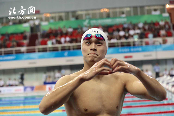 天津北方網訊 8月31日,第十三屆全運會游泳大項正式在天津奧林匹克中心鳴鑼開賽。首日比賽共產生4枚金牌。分別為男子400米個人混合泳、男子400米自由泳、女子4×100米自由泳接力以及女子400米個人混合泳。男子400米自由泳決賽中,孫楊發揮完美,以3分41秒94奪冠。