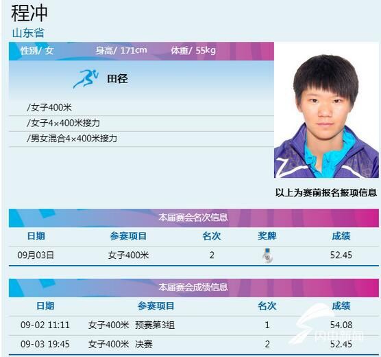 大眾網(wǎng)9月4日訊 9月3日晚,在天津舉行的第十三屆全運(yùn)會(huì)田徑女子400米決賽中,德州選手程沖跑出了52秒45,成功刷新自己的最好成績(jī),并為山東代表團(tuán)再添一枚銀牌。金牌則被四川隊(duì)的楊會(huì)珍以51秒80的成績(jī)奪得,湖南隊(duì)選手童曾歡排名第三。