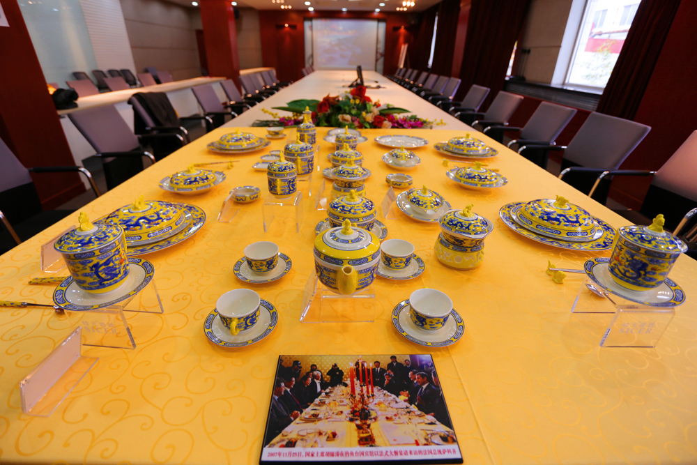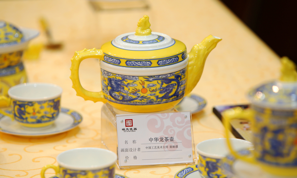 “1999年初,釣魚臺國賓館在全國范圍內(nèi)遴選國宴用瓷,各大陶瓷產(chǎn)區(qū)的知名陶瓷企業(yè)都參與了。硅元以陳貽謨?yōu)榇淼脑O(shè)計人員,參考中國歷代古瓷珍品,靈活運用民族元素,突出硅元瓷器的材質(zhì)和釉料優(yōu)勢,研發(fā)設(shè)計了中華龍系列產(chǎn)品!币髸▽τ浾呓榻B說。1999年9月份,建國50周年大慶前夕,中華龍產(chǎn)品從全國各大陶瓷產(chǎn)區(qū)脫穎而出進入釣魚臺國賓館等地。