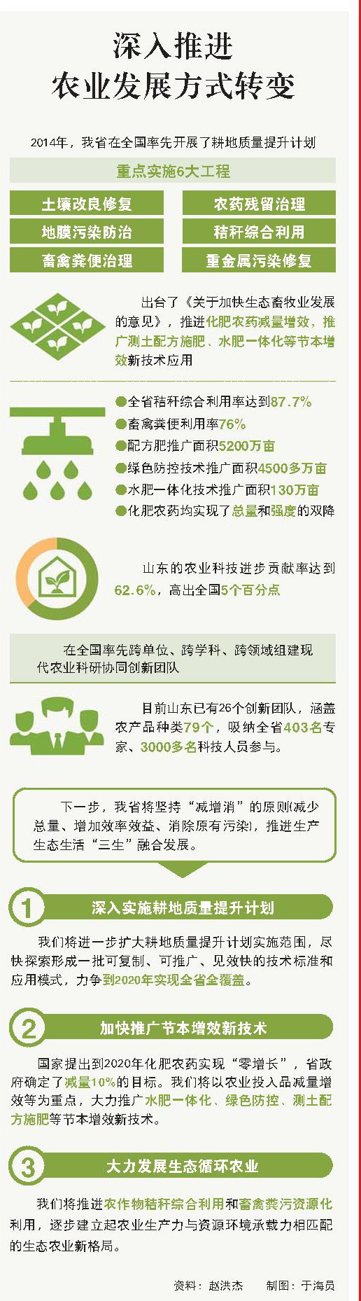山東以綠色發(fā)展理念為指引,堅(jiān)持“減增消”的原則(減少總量、增加效率效益、消除原有污染),推進(jìn)生產(chǎn)生態(tài)生活“三生”融合發(fā)展,植物動(dòng)物微生物“三物”循環(huán)共生,加快構(gòu)建生態(tài)修復(fù)長(zhǎng)效機(jī)制。同時(shí)創(chuàng)新體制機(jī)制整合農(nóng)業(yè)科研人員的力量,讓科研成果寫在大地上。