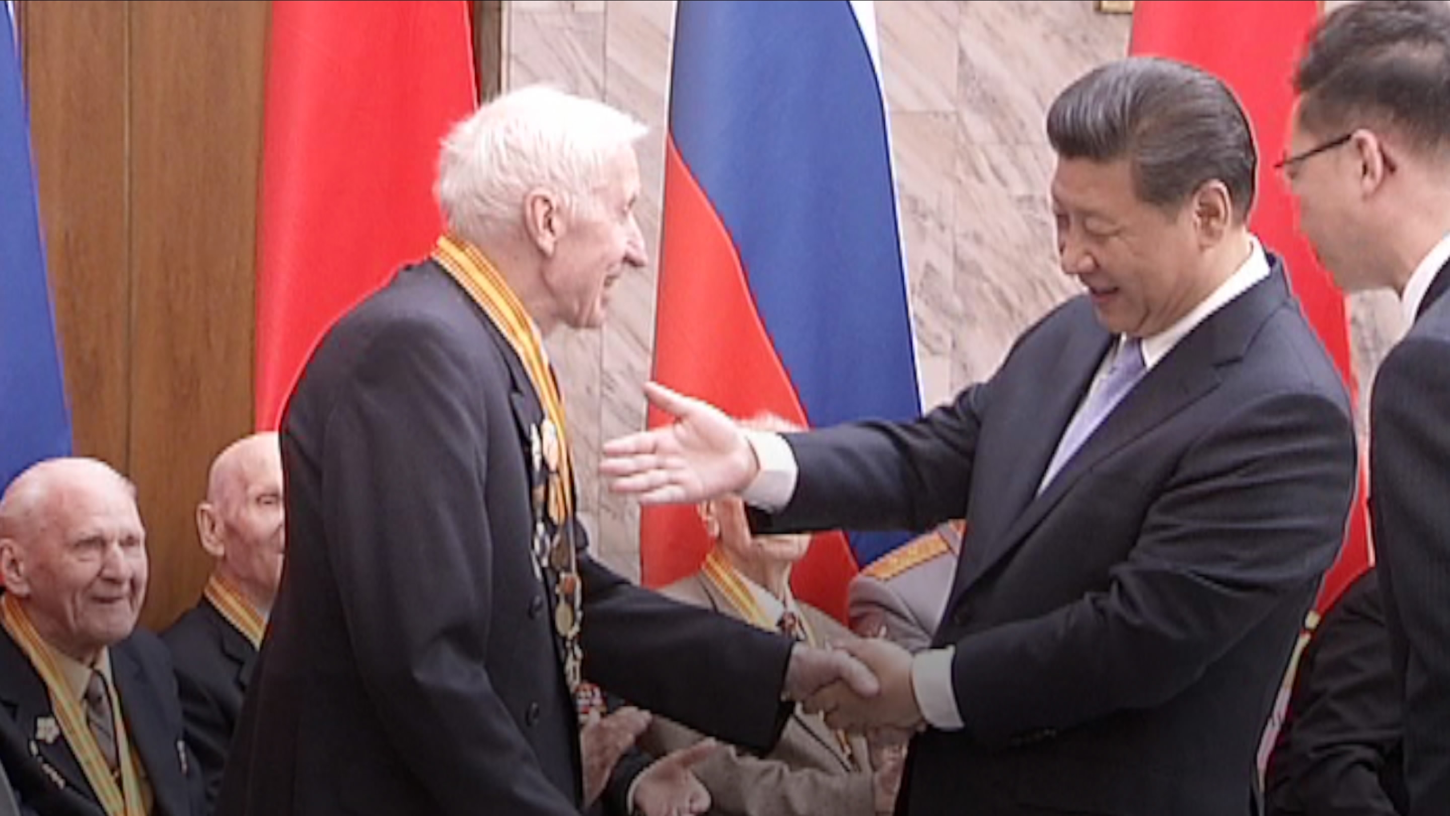 Xi awarded medals to Russian veterans for their contributions to China’s victory against Japanese aggression and the World Anti-Fascist War. Many of the veterans attending the event had limited mobility, so Xi brought the medals over to them.