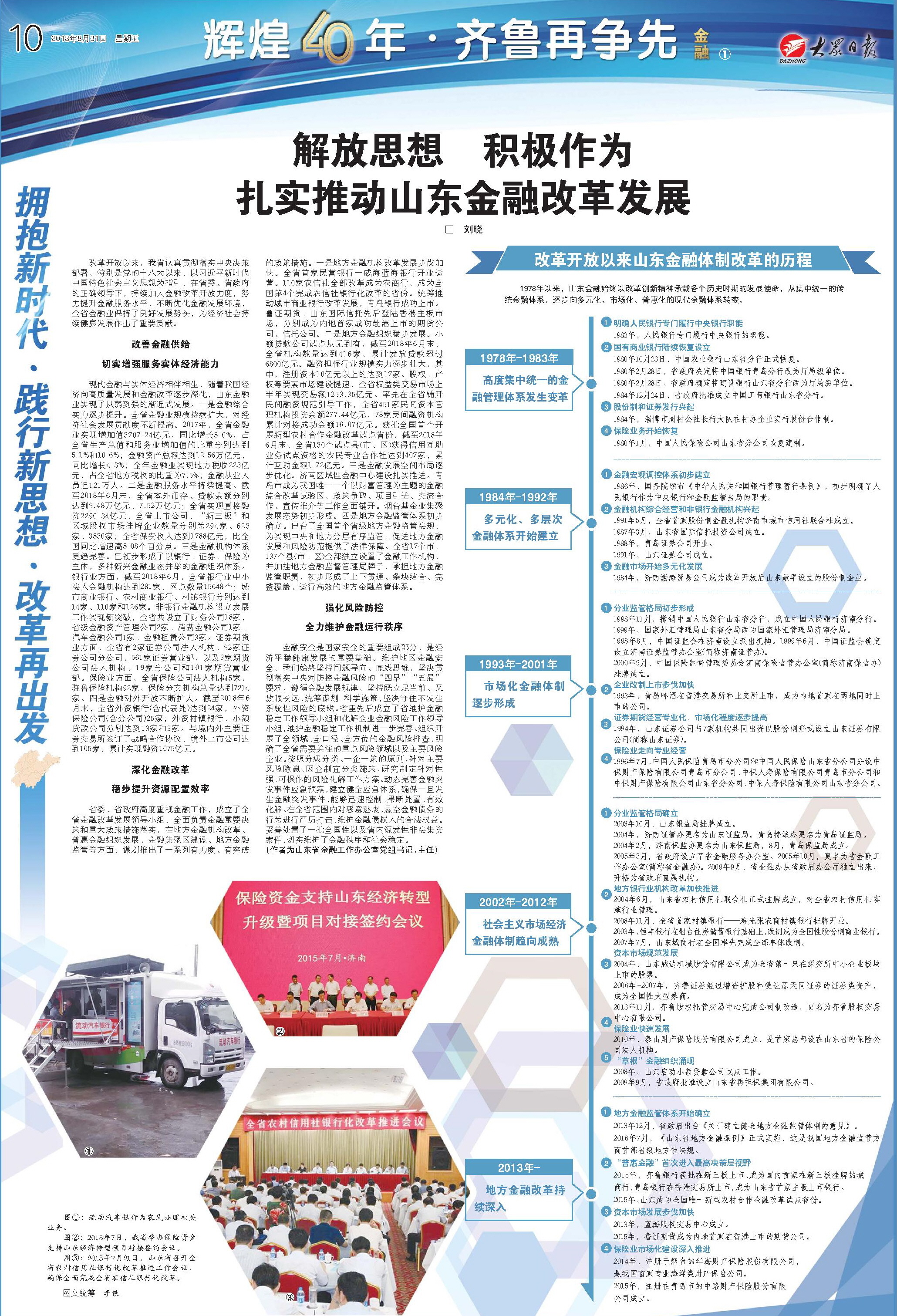 省委、省政府高度重視金融工作,成立了全省金融改革發(fā)展領(lǐng)導(dǎo)小組,全面負(fù)責(zé)金融重要決策和重大政策措施落實,在地方金融機(jī)構(gòu)改革、普惠金融組織發(fā)展、金融集聚區(qū)建設(shè)、地方金融監(jiān)管等方面,謀劃推出了一系列有力度、有突破的政策措施。一是地方金融機(jī)構(gòu)改革發(fā)展步伐加快。全省首家民營銀行—威海藍(lán)海銀行開業(yè)運(yùn)營。110家農(nóng)信社全部改革成為農(nóng)商行,成為全國第4個完成農(nóng)信社銀行化改革的省份。統(tǒng)籌推動城市商業(yè)銀行改革發(fā)展,青島銀行成功上市。魯證期貨、山東國際信托先后登陸香港主板市場,分別成為內(nèi)地首家成功赴港上市的期貨公司、信托公司。二是地方金融組織穩(wěn)步發(fā)展。小額貸款公司試點(diǎn)從無到有,截至2018年6月末,全省機(jī)構(gòu)數(shù)量達(dá)到416家,累計發(fā)放貸款超過6800億元。融資擔(dān)保行業(yè)規(guī)模實力逐步壯大,其中,注冊資本10億元以上的達(dá)到17家。股權(quán)、產(chǎn)權(quán)等要素市場建設(shè)提速,全省權(quán)益類交易市場上半年實現(xiàn)交易額1253.35億元。率先在全省鋪開民間融資規(guī)范引導(dǎo)工作,全省451家民間資本管理機(jī)構(gòu)投資余額277.44億元,78家民間融資機(jī)構(gòu)累計對接成功金額16.07億元。獲批全國首個開展新型農(nóng)村合作金融改革試點(diǎn)省份,截至2018年6月末,全省130個試點(diǎn)縣(市、區(qū))獲得信用互助業(yè)務(wù)試點(diǎn)資格的農(nóng)民專業(yè)合作社達(dá)到407家,累計互助金額1.72億元。三是金融發(fā)展空間布局逐步優(yōu)化。濟(jì)南區(qū)域性金融中心建設(shè)扎實推進(jìn)。青島市成為我國唯一一個以財富管理為主題的金融綜合改革試驗區(qū),政策爭取、項目引進(jìn)、交流合作、宣傳推介等工作全面鋪開。煙臺基金業(yè)集聚發(fā)展態(tài)勢初步形成。四是地方金融監(jiān)管體系初步確立。出臺了全國首個省級地方金融監(jiān)管法規(guī),為實現(xiàn)中央和地方分層有序監(jiān)管、促進(jìn)地方金融發(fā)展和風(fēng)險防范提供了法律保障。全省17個市、137個縣(市、區(qū))全部獨(dú)立設(shè)置了金融工作機(jī)構(gòu),并加掛地方金融監(jiān)督管理局牌子,承擔(dān)地方金融監(jiān)管職責(zé),初步形成了上下貫通、條塊結(jié)合、完整覆蓋、運(yùn)行高效的地方金融監(jiān)管體系。