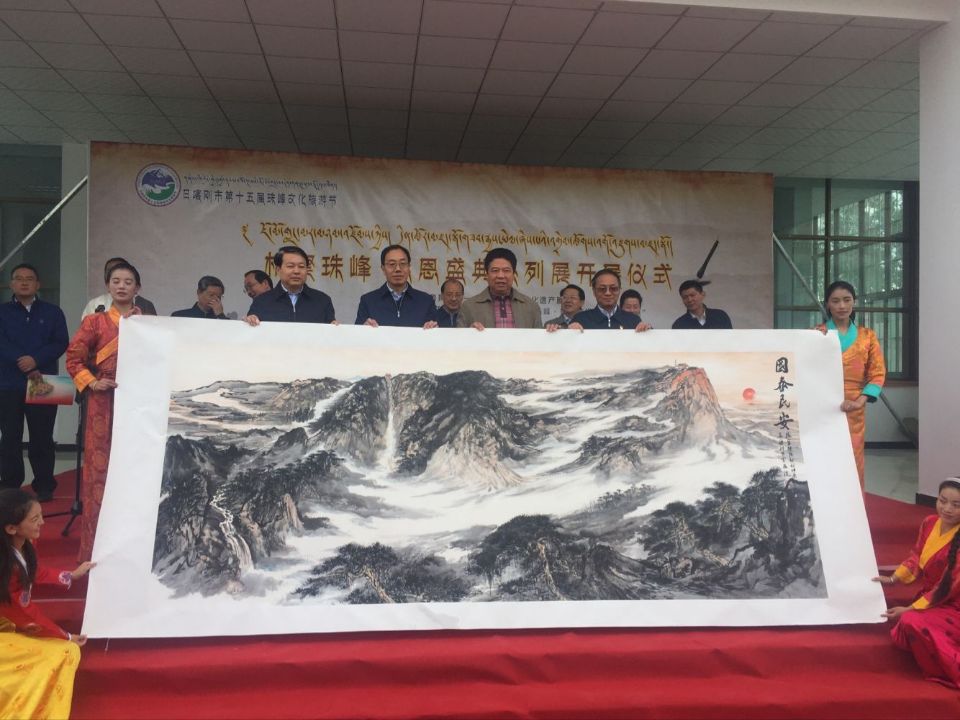 今天的開展儀式上,山東省委宣傳部副部長劉致福、山東省文聯(lián)副主席矯紅代表山東省文聯(lián)、美協(xié)、書協(xié)、攝協(xié)向日喀則捐贈(zèng)書畫和攝影作品,捐贈(zèng)作品包括山東省文聯(lián)黨組書記于欽彥題款、山東美協(xié)藝術(shù)家合作的山水畫——國泰民安1幅、山東書協(xié)作品40幅、山東攝協(xié)作品26幅。