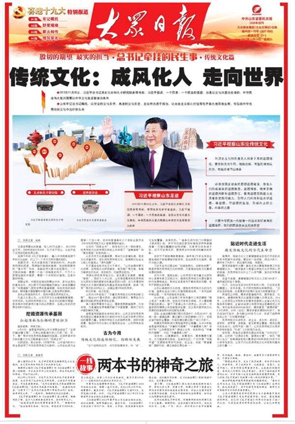 2013年11月26日,習近平總書記來到孔子故里曲阜視察,先后參觀了孔府和孔子研究院,主持召開專家座談會,并發(fā)表重要講話。“總書記指著《孔子家語通解》和《論語詮解》說:‘這兩本書我要仔細看看。’我激動地回答:‘太榮幸了!’總書記問我是哪個學校畢業(yè)的?我說,曲阜師范大學。”一晃四年,楊朝明仍然記憶猶新。